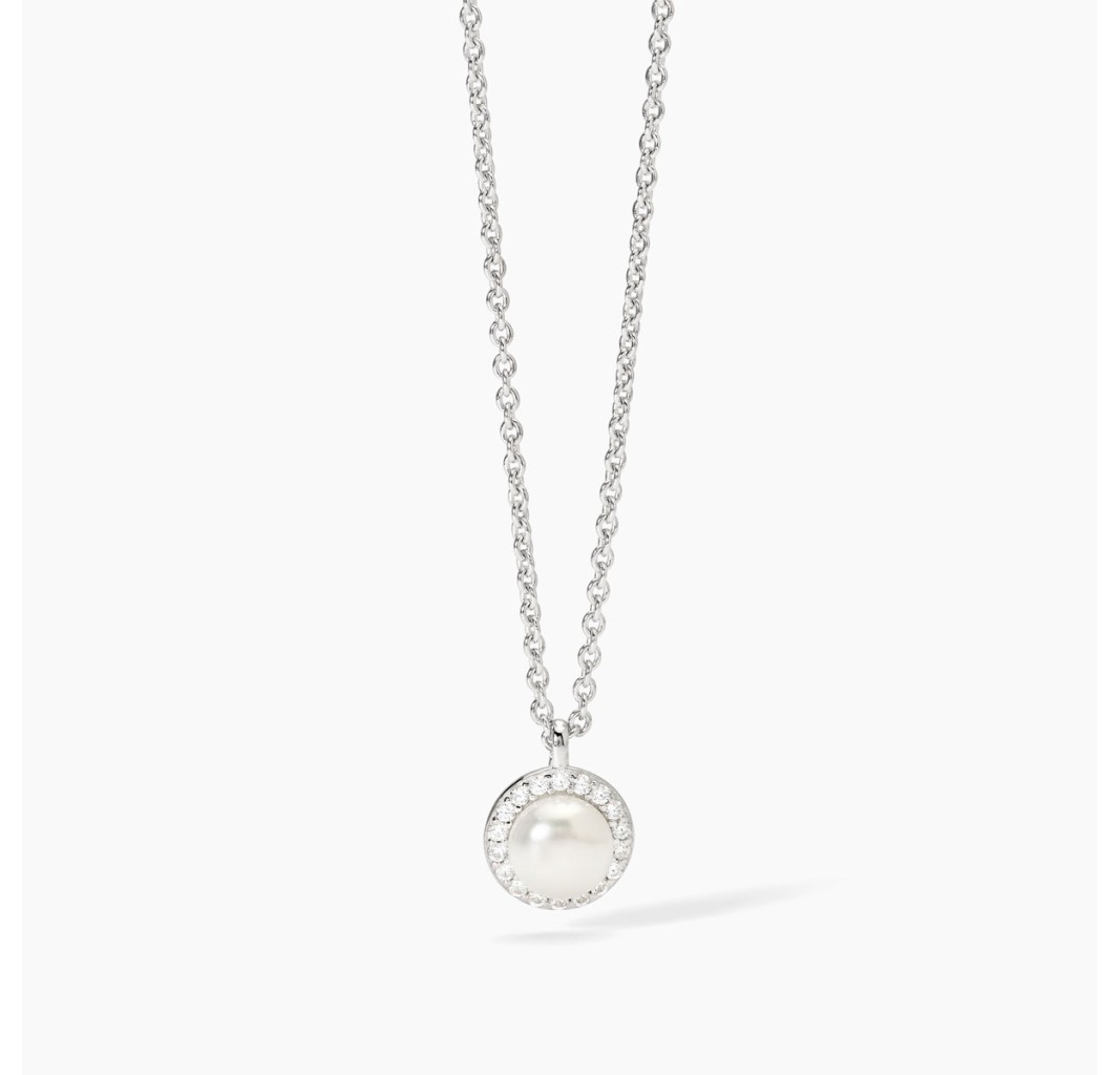 Gargantilla de plata 925 rodiada con cadena forzatina de 1,5 mm, perla cultivada botón 6,5-7 mm y circonitas blancas 1,25 mm, largo regulable de 40 a 45 cm