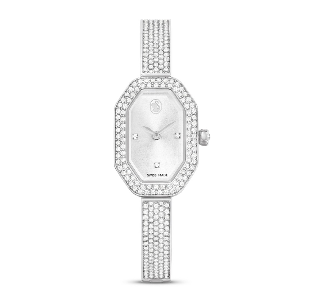 SWAROVSKI RELOJ DEXTERA BANGLE, FABRICADO EN SUIZA, BRAZALETE DE METAL, TONO PLATEADO, ACERO INOXIDABLE